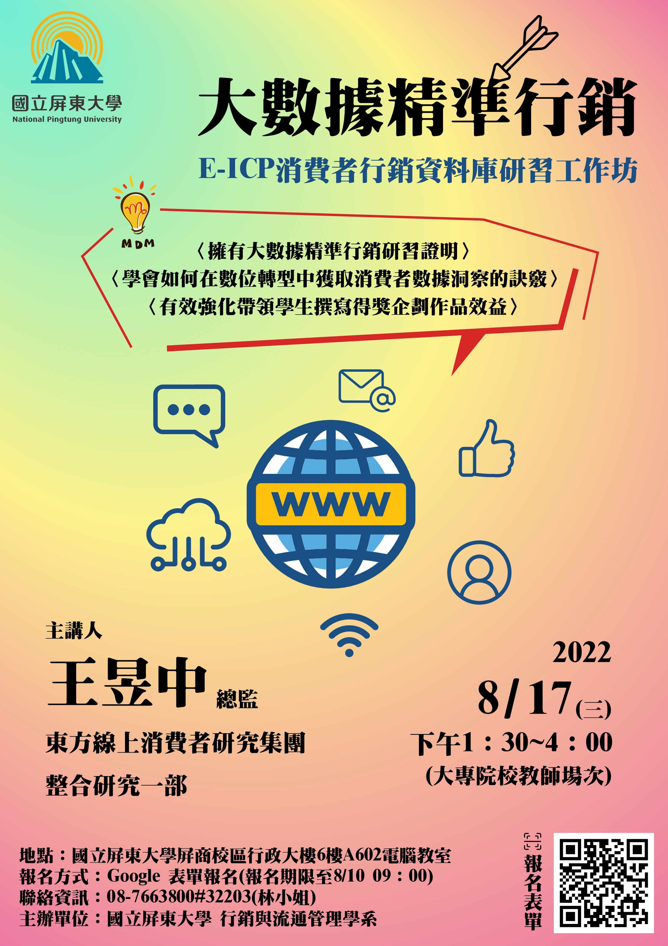 國立屏東大學行銷與流通管理學系舉辦「大數據精準行銷E-ICP消費者行銷資料庫研習工作坊」訊息。
