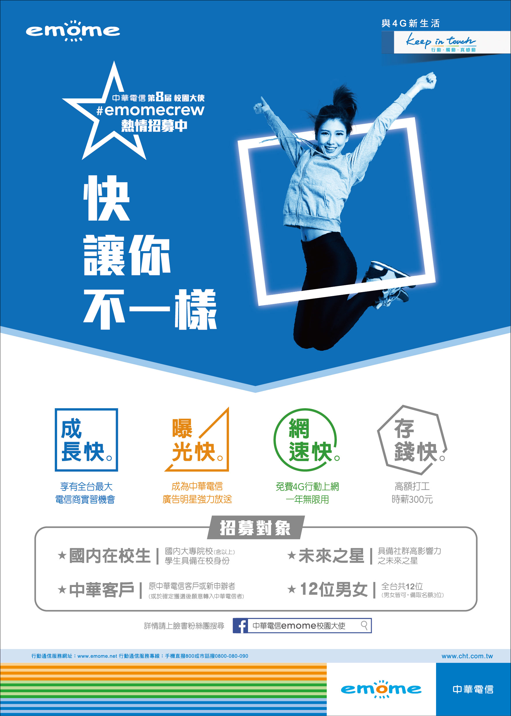 六、詳細資訊請參看粉絲團:中華電信emome 校園大使https://goo.gl/5jcFF0