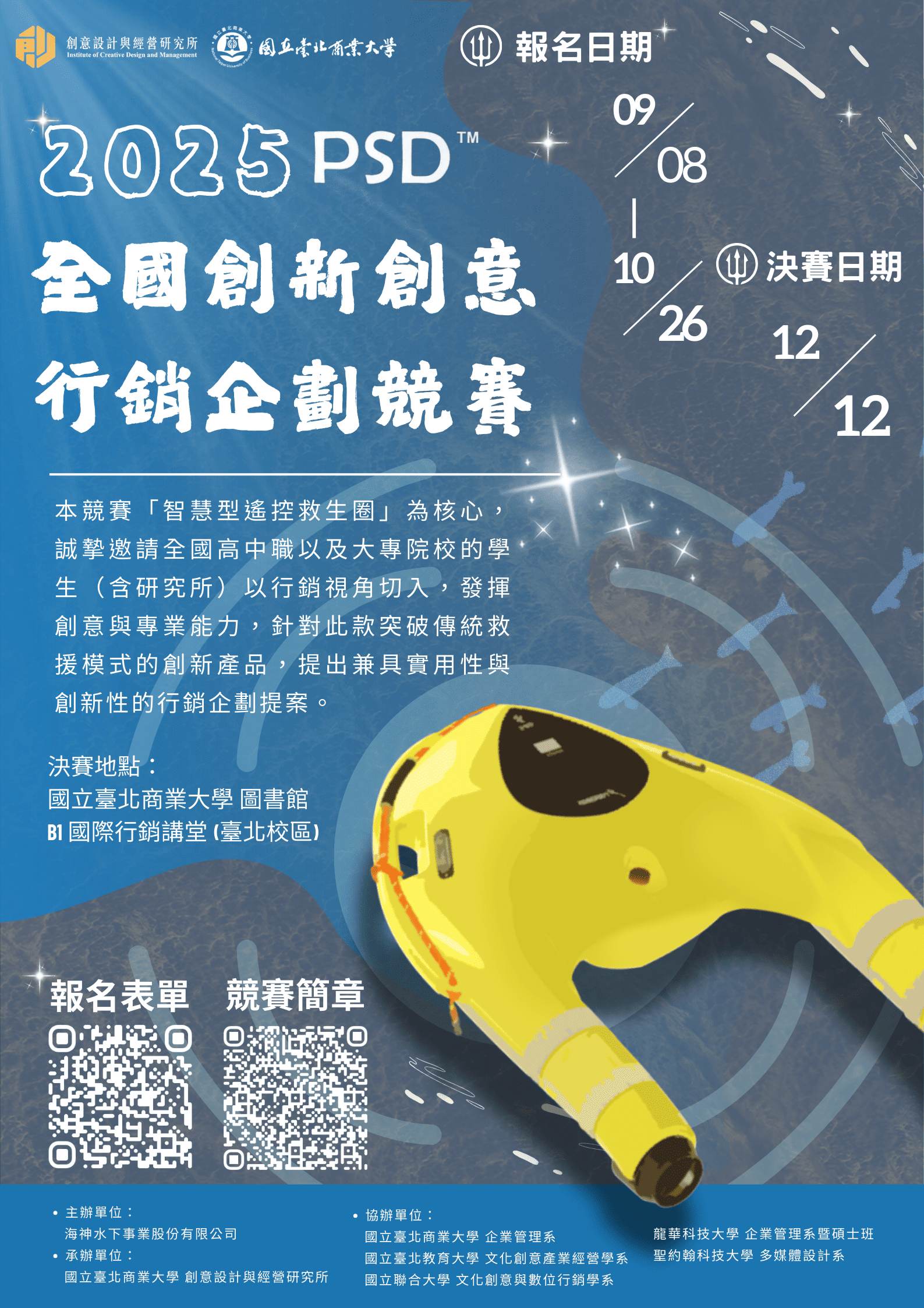 國立臺北商業大學創意設計與經營研究所承辦海神水下事業股份有限公司之「2025 PSD全國創新創意行銷企劃競賽」活動辦法更新,請參閱附件。