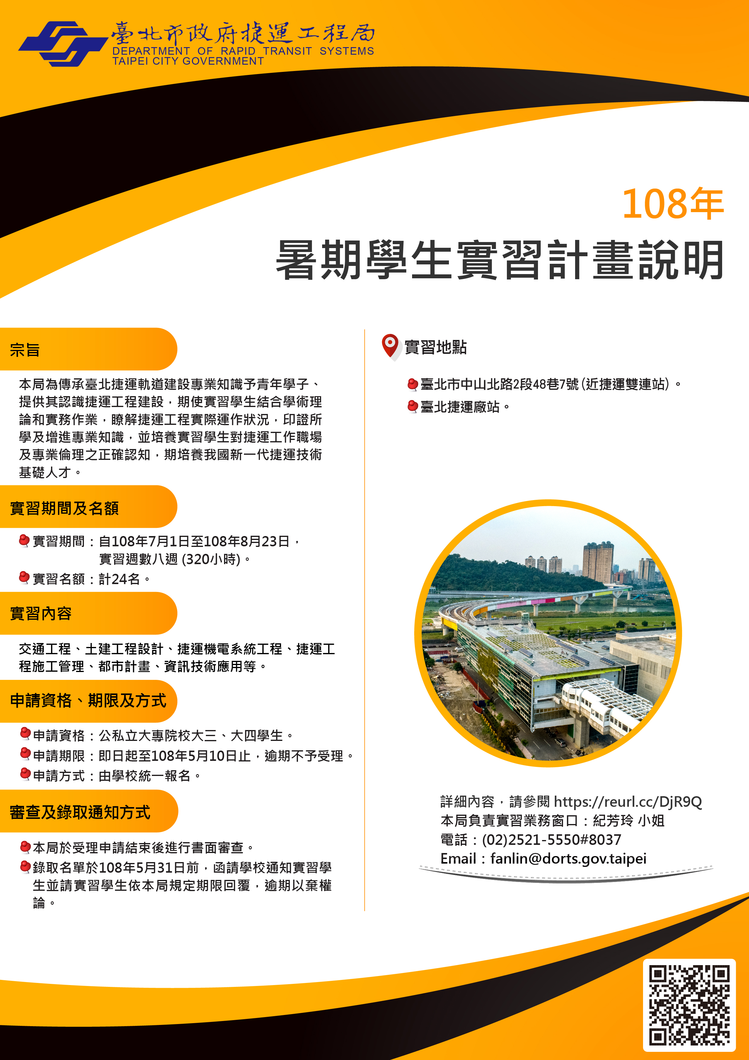 臺北市政府捷運工程局108年度暑期實習申請相關事宜