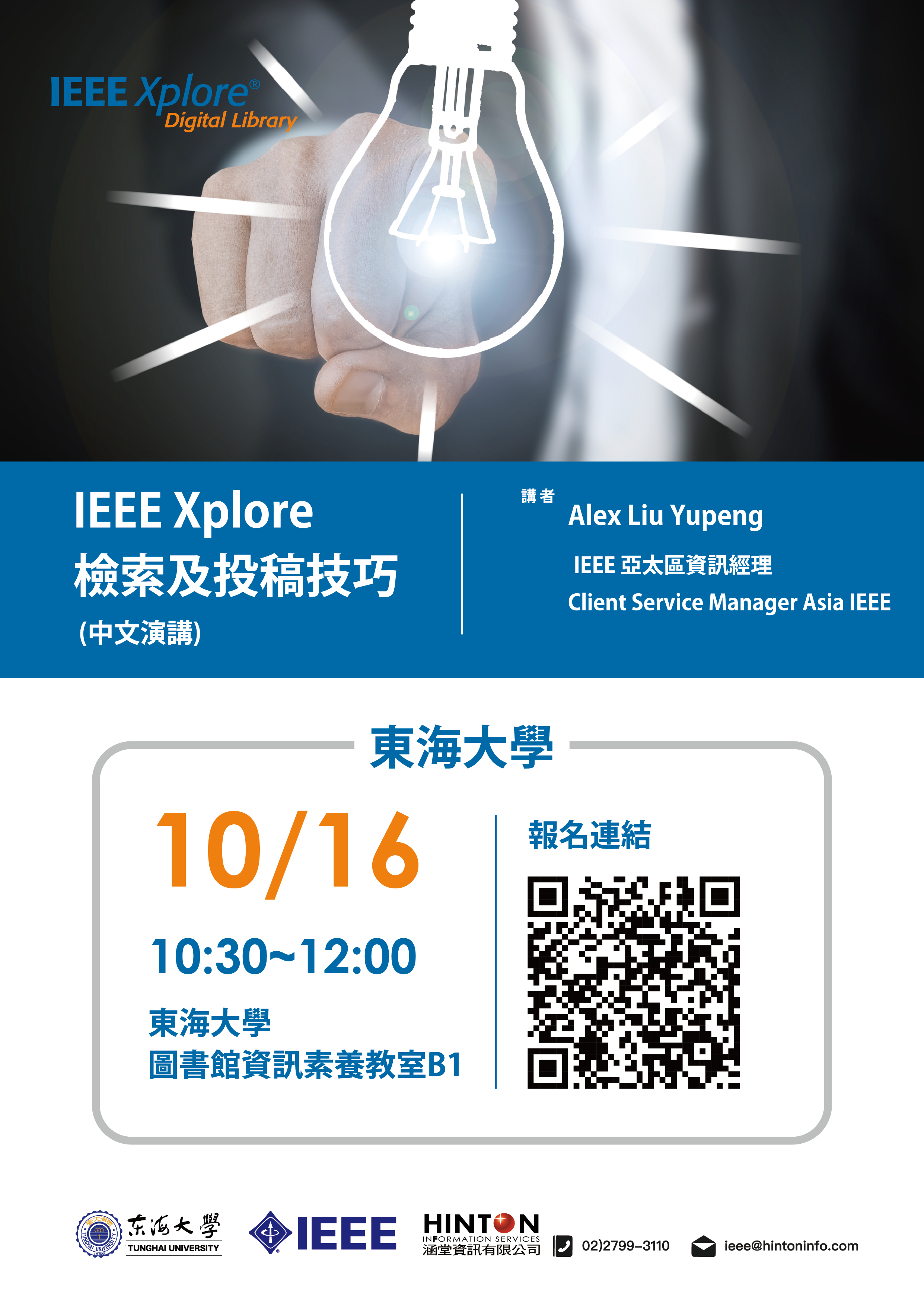 【IEEE 講座- 東海大學 】將在 10/16 (週三)10:30~12:00 於圖書館資訊素養教室B1舉辦 ,本講座採免費線上報名。
