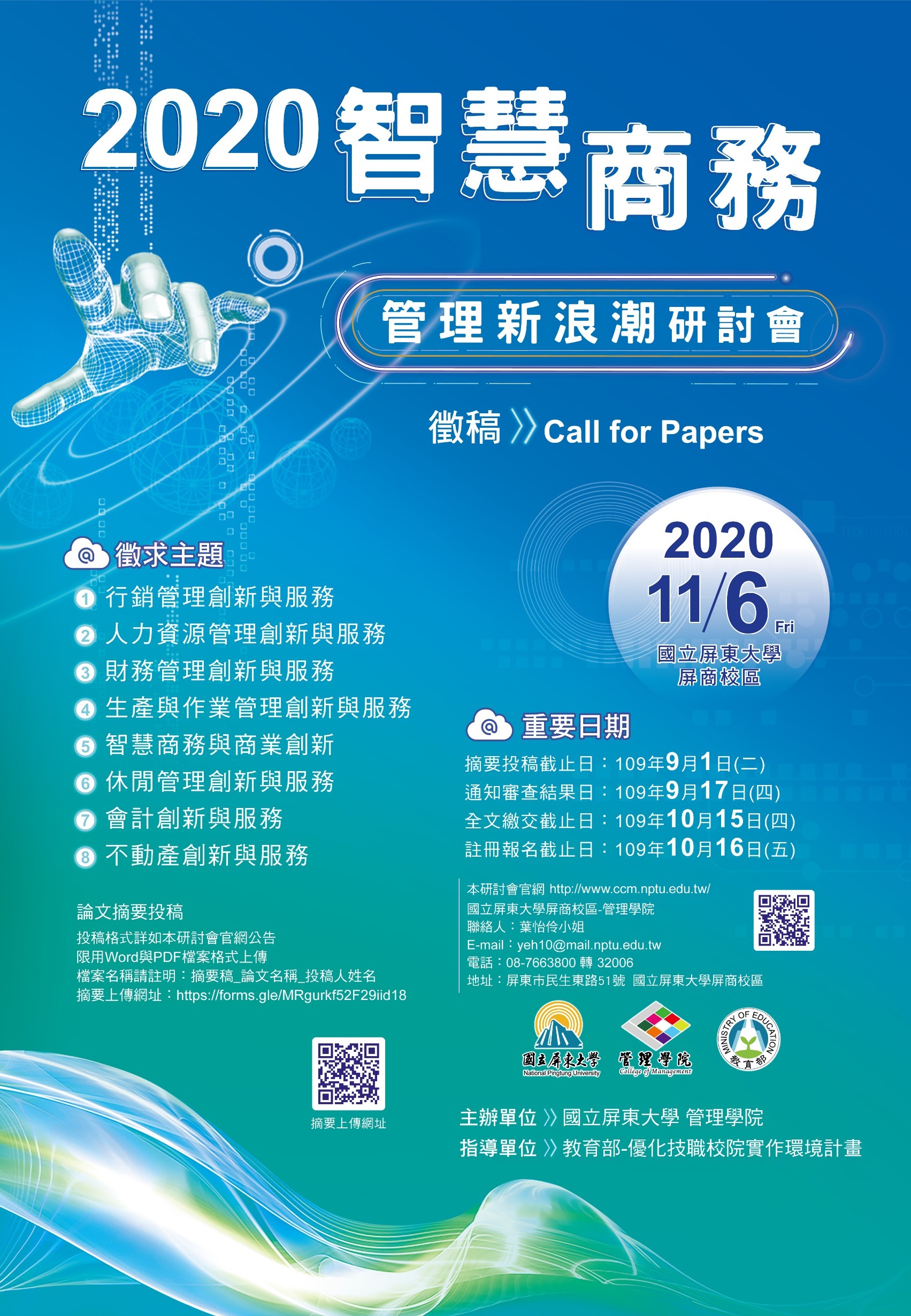 國立屏東大學管理學院訂於民國109年11月6日(星期五)舉辦「2020 智慧商務管理新浪潮研討會」。