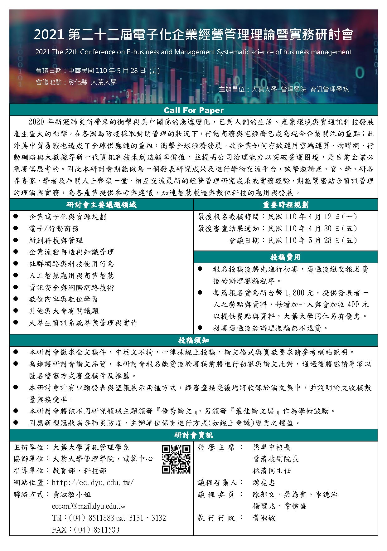 第22屆電子化企業經營管理理論暨實務研討會;初稿截止於4月12日,詳細資訊請參閱附件。