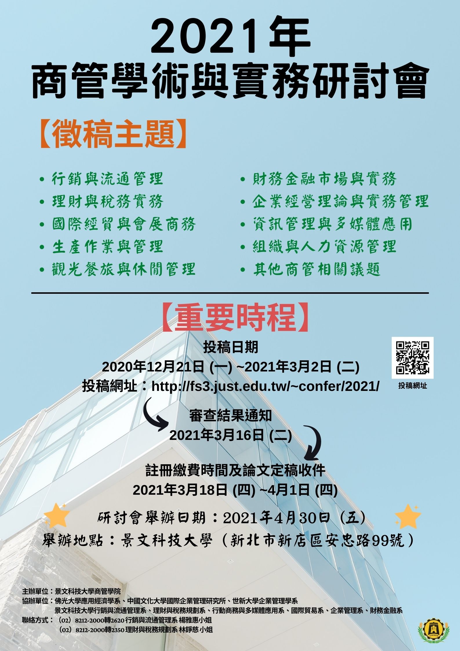 景文科技大學商管學院辦理「2021年商管學術與實務研討會」投稿截止時間將延長至110年3月02日(星期二)。