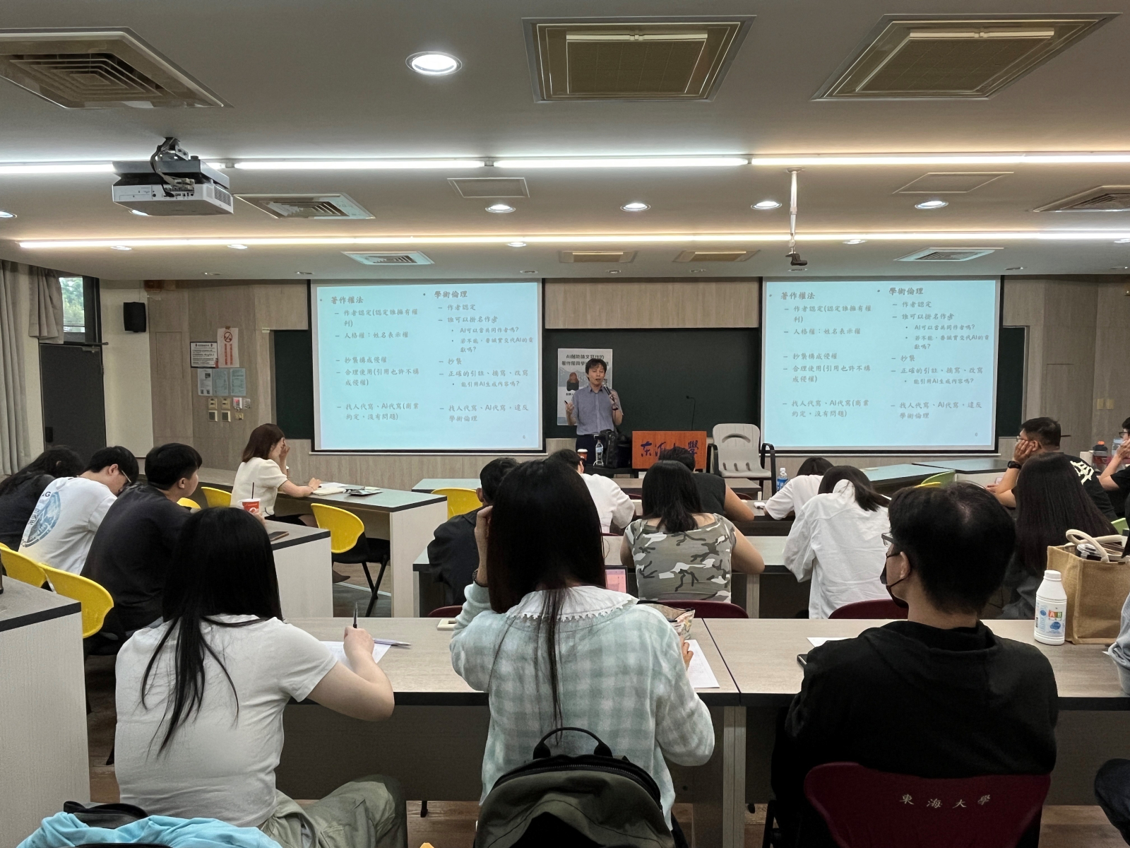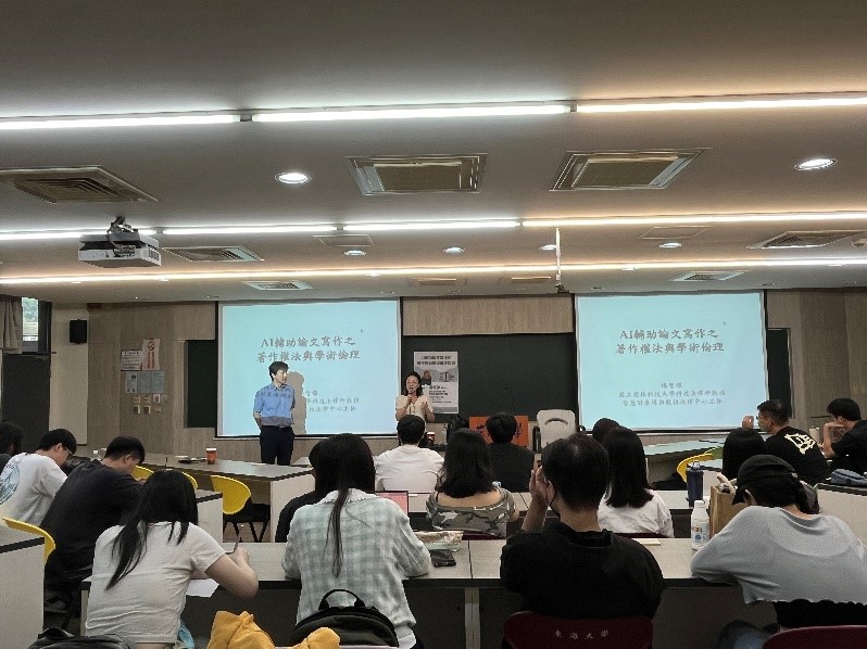 楊智傑教授透過實例說明AI生成內容可能引發的法律與倫理爭議,並分享國內外相關案例,使同學們了解到即使AI能協助寫作,創作責任仍由使用者承擔。此外,老師也介紹AI在翻譯、潤稿與文獻搜尋的實用性,提醒學生不能完全仰賴工具,更應保有查證與判斷能力。