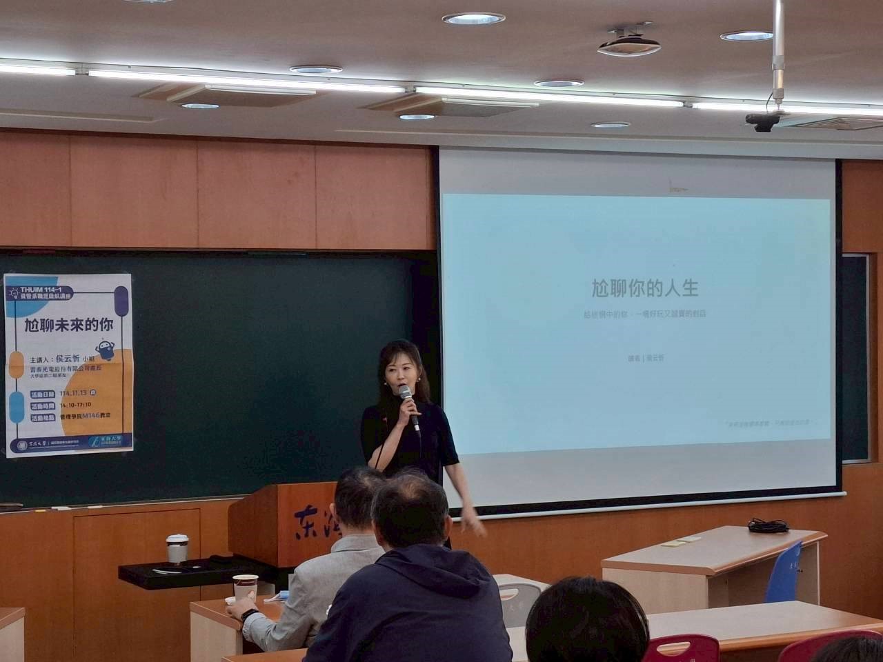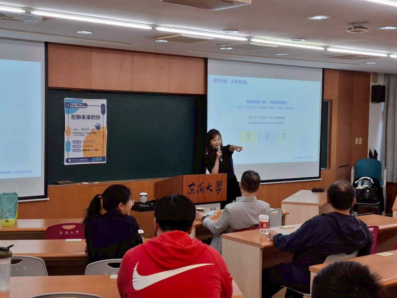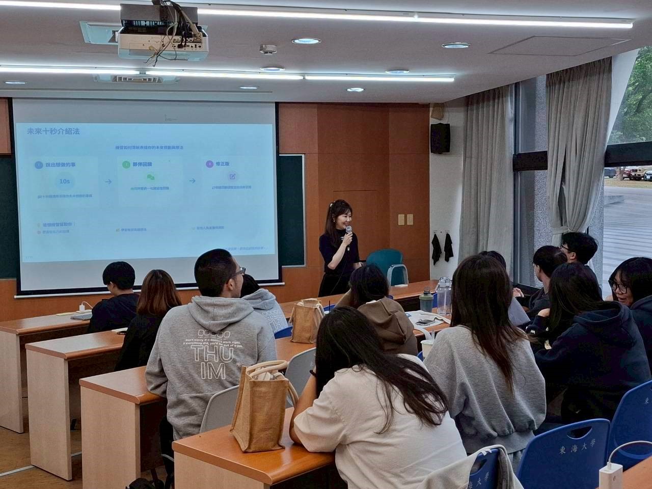 最讓學生受用的是「未來十秒介紹法」。講者示範如何用三步驟清楚表述自己的現況、期待方向以及所需資源。學生發現,過去的自我介紹常常過於冗長、缺乏重點,而這套方法讓他知道未來在面試、社交場合或與企業導師互動時,應如何精準且有重點地呈現自己。